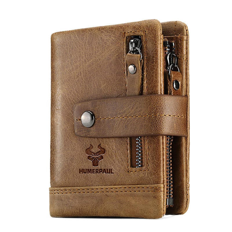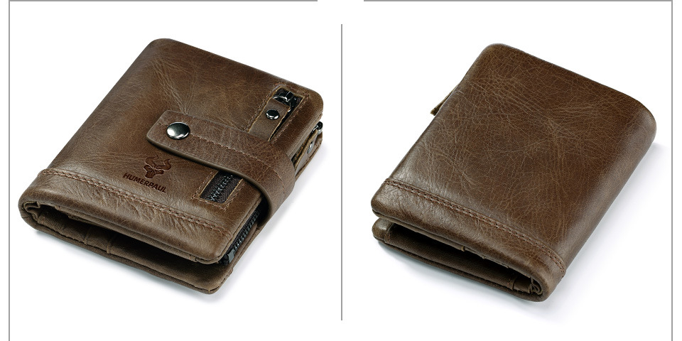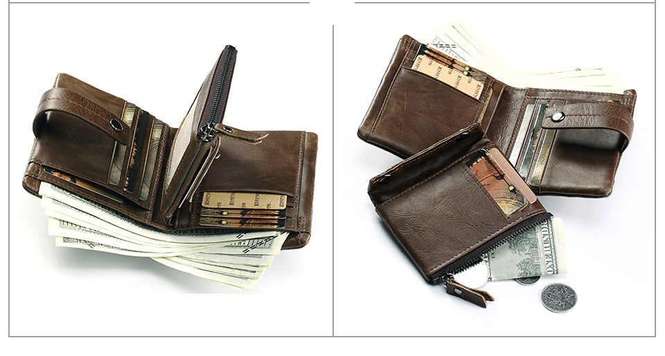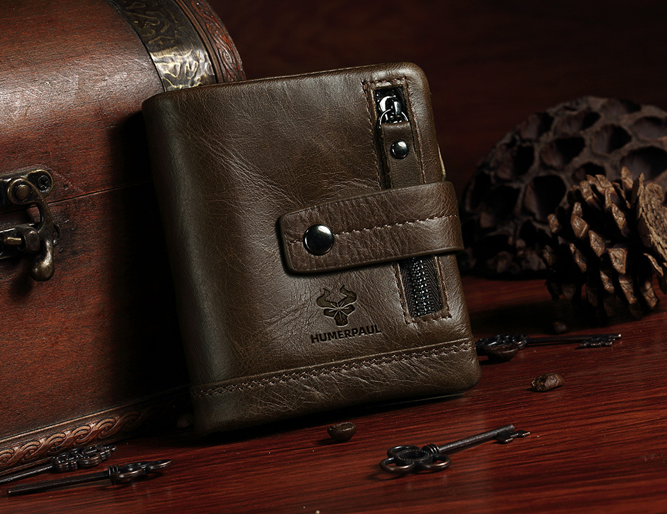Vintage Crazy Horse leather clutch wallet with zipper security and spacious multi-pocket organization.