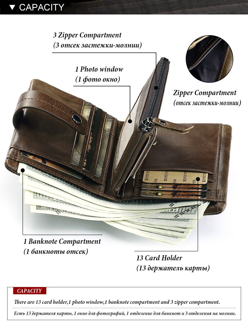 Interior: Card slots, ID window, coin pocket, banknote compartment, zipper storage